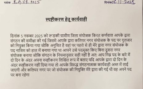 पिरान कलियर। भीम आर्मी भारत एकता मिशन उत्तराखंड में कलियर नगर संयोजक की नियुक्ति को लेकर संगठन में गंभीर मतभेद उभर आए हैं। इस संबंध में प्रदेश अध्यक्ष अमरीश कपिल द्वारा संबंधित पदाधिकारी को नोटिस जारी कर दो दिनों के भीतर लिखित स्पष्टीकरण प्रस्तुत करने को कहा गया है। जारी नोटिस के अनुसार, 5 […]